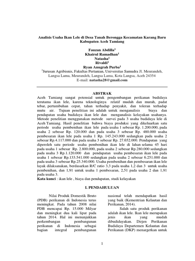 Kegiatan budidaya ikan lele dumbo Clarias gariepinus yang dilakukan di Kampung Lele baik berupa pengamatan pengukuran serta wawancara langsung. Biasanya pembeli membawa drum milik mereka sendiri untuk mengemas benih ikan lele. ANALISA USAHA BUDIDAYA PEMBESARAN IKAN LELE SANGKURIANG Clarias sp DI KABUPATEN ACEH BARAT DAYA Oleh Muhammad Isa 1 Erlita SPi 2 Dewi Fithria SP MP 2 ABSTRAK Ikan lele sangkuriang Clarias sp menjadi salah satu komoditi hasil.